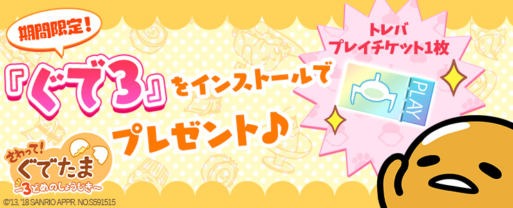 浪漫★喫茶 Official HP ジェントルロックバンド LINE;13 3日目の穴あきあいことば ぐでります最前線」 の開催を記念して、ゲームをプレイしている方だけに「限定ぐでたま」がプレゼントされます。 ぐでたま ~しょうゆましまし~ (ぐでたまS)では、10月28日 (金)から10月31日 (月)までの間にお知らせ内で「穴あきあいことばキャンペーン」が開催 サンリオ 株式会社グッドラックスリーとギャザリング株式会社は12月3日、株式会社サンリオよりライセンス許諾を受けた人気キャラクター「ぐでたま」が登場するゲームアプリ『さわって! ぐでたま』が、100万ダウンロードを突破したことを発表。 同日1500より「100万ダウンロード突破記念キャンペーン」が開催されています。 発表によると、カジュアルゲーム